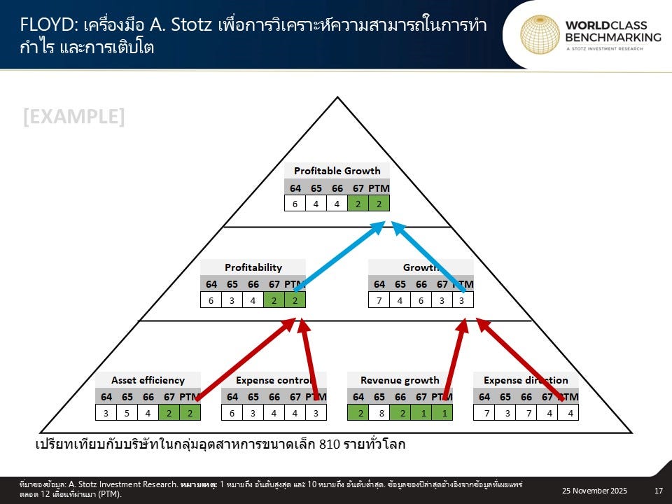 วิธีอ่านส่วนล่างสุดของสามเหลี่ยม ประสิทธิภาพของสินทรัพย์ การควบคุมค่าใช้จ่าย การเติบโตของรายได้ และทิศทางของค่าใช้จ่าย