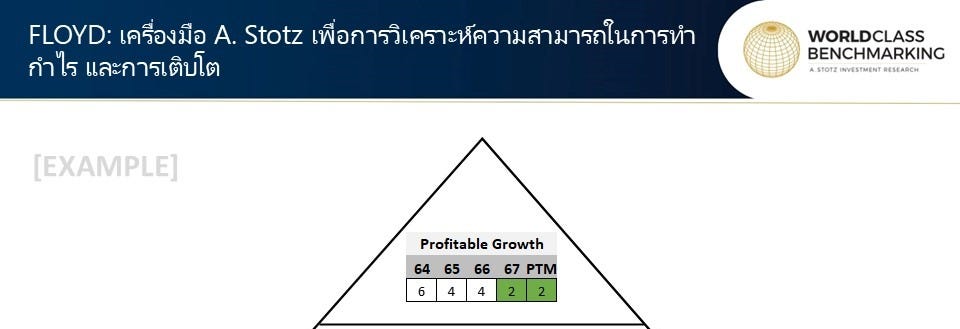 ผลลัพธ์ที่ส่วนบนสุดของสามเหลี่ยมนี้จะถูกอธิบายด้วยผลลัพธ์ที่อยู่ด้านล่าง อันดับที่สองและสามของสามเหลี่ยมจะอธิบายว่า อะไรคือปัจจัยขับเคลื่อนการเติบโตที่มีกำไร งานวิจัยของเราแสดงให้เห็นว่า ตลาดให้ความสำคัญกับการเติบโตมากกว่าความสามารถในการทำกำไร แต่แน่นอนว่าดีที่สุดคือการที่บริษัทสามารถทำได้ดีทั้งสองด้าน